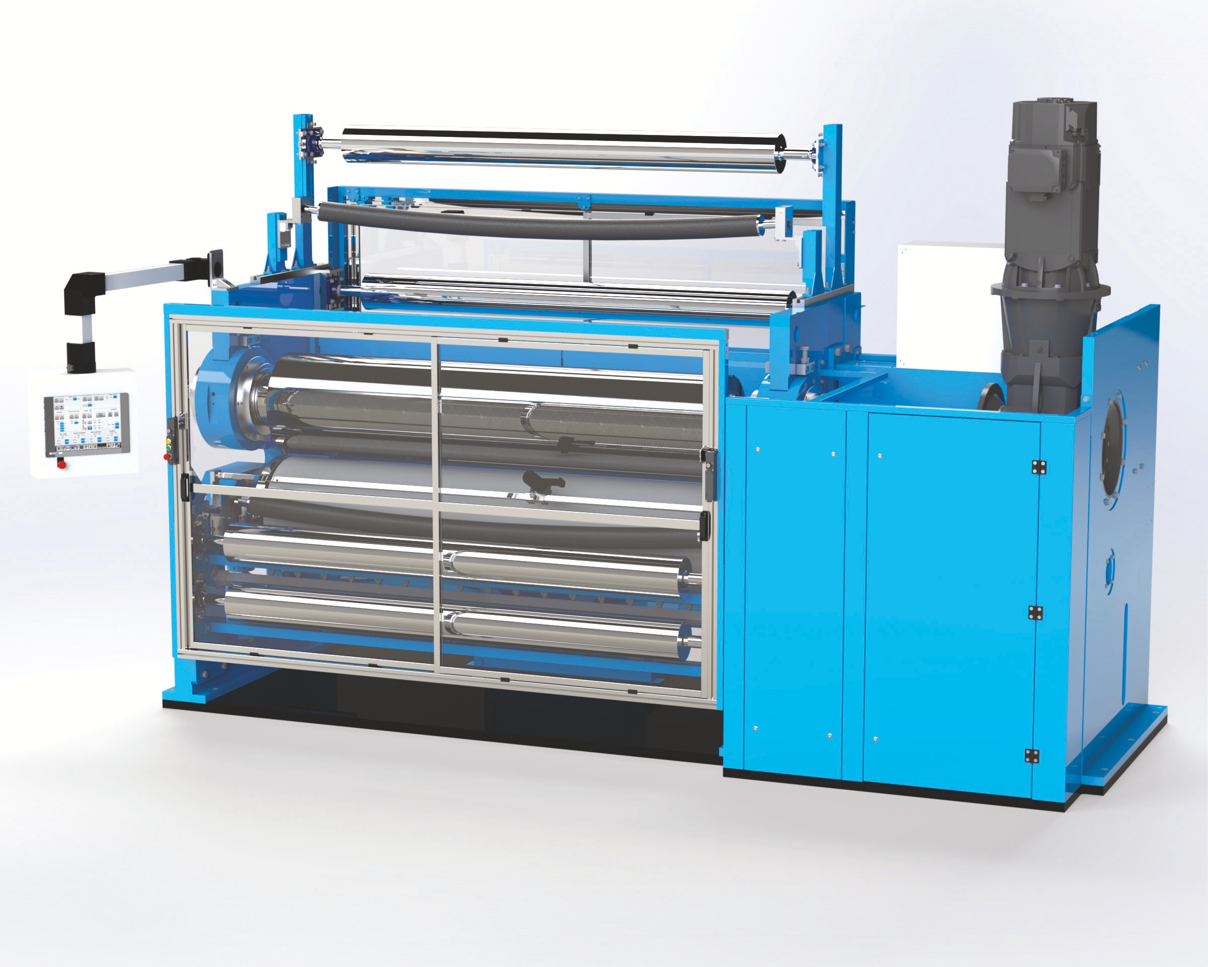Latest development by Guarneri Technology is the embossing calender for paper industry. An important aspect of paper production is the embossing, i.e. the process by which the paper passes through a special polyamide GTP6 sleeve roller (NIPCO™ or conventional) and a steel roller with an engraved surface. The strenght and technology typical of the GT embosseing calender, dedicated to paper production, enhances the embossing process andguarantees results characterised by extreme engraving precision thanks to the NIPCO™ roller that perfectly controls the pressure uniformity along the entire width of the rollers. It is possible to control not only the pressure range between the cylinders but also to control the pressure zone by zone with the new Zone Pressure Control HT. Fully automated entry and exit frames, as well as loading and unloading of paper rolls.