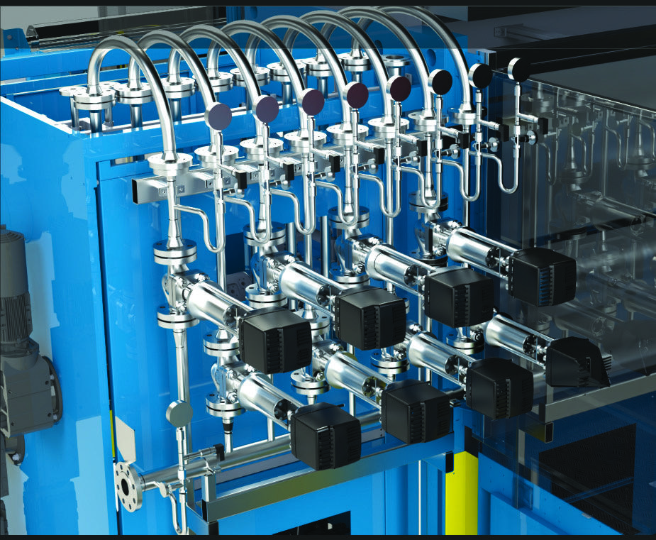 The independent pressure control zones are operated by special valves for diathermic oil up to 300°C complete with: opening regulation through electric or pneumatic system, position transducer and analogue pressure gauge. Valves are installed on the inlet oil pipes of the NIPCO™ roller. The system is operated by PLC. Operator can select through the touch panel the working mode between linear pressure or differentiated pressure. By linear pressure mode the NIPCO™ Hot works against the steel roller using a single pressure value over the entire width while with differentiated pressure it is possible to have up to 8 different pressures each of them independently adjustable.