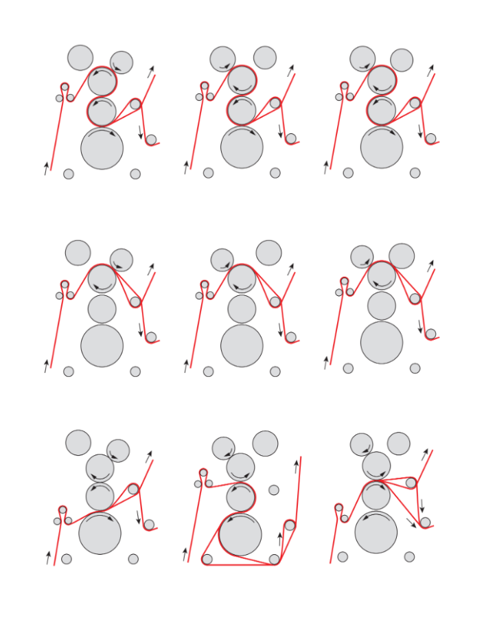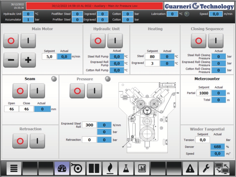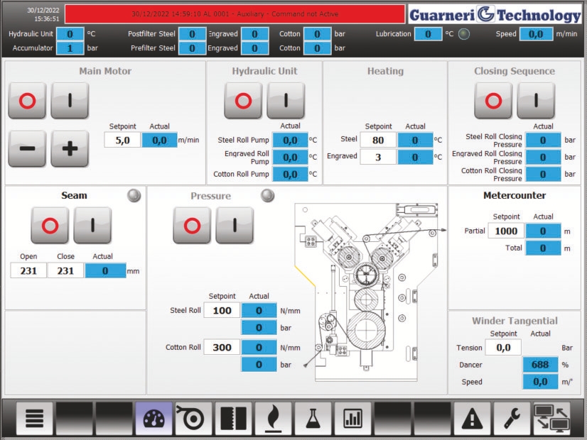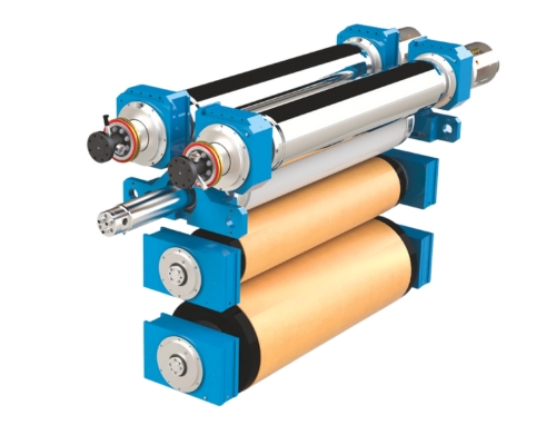 The 5 bowls of this new generation of Guarneri Technology. Nipco™ Multiflex calender offers the possibility to select the most suitable fabric passage among several combinations. By using the Nipco™ Technology, in its defined nip configuration for embossing effects, the calender offers the possibility to select, through a ‘revolving system’, one of 3 different designs without changing the bowls. All nips are controlled by this well known Nipco™ system combined with one soft nip, cotton/cotton, as to where a small diameter cotton bowl is acting on an enlarged cotton bowl, reaching a result close to frictioning. This means highest density and most softened touch.