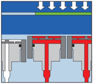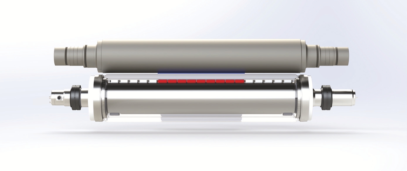 A NIPCO™ roll has three key elements: - the stationary cross shaft - the rotating roll shell - the hydrostatic pistons Of these, the cross shaft is the element that supports the entire roll structure. It transmits force from the calender into the nip. The NIPCO™ shell rotates freely over the cross shaft. Either steel or highly flexible shells are selected, depending on the application case concerned. The surface temperature of the shell is controllable. Hydrostatic pistons individually installed in the cross shaft support the freely rotating roll shell against the load from outside. With the conventional NIPCO™ roll, these hydrostatic pistons are actuated zone-by-zone. This allows individual line load curves over the entire width of the nip – even with the smallest linear loads.